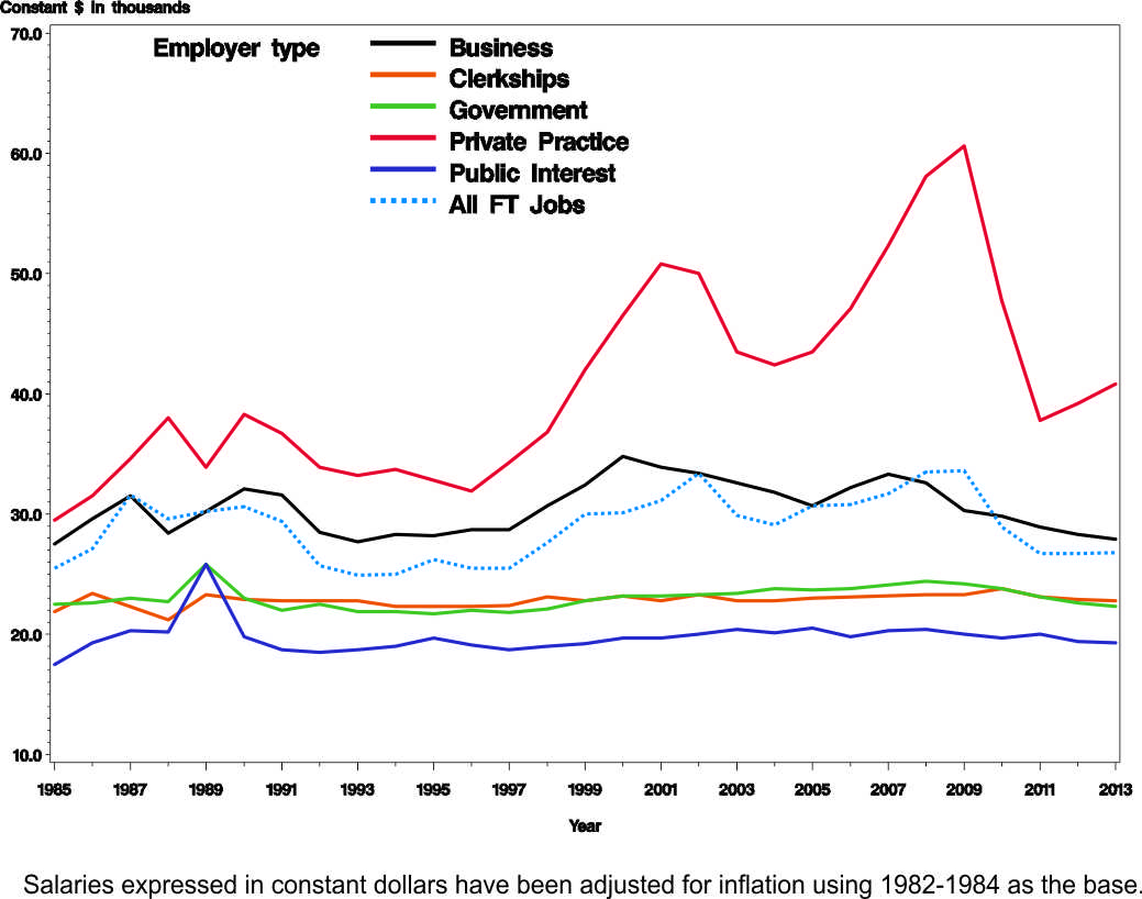 NALP's bimodal salary curve has clearly illustrated the earnings gap between law graduates who take a job in a large law firm and graduates who take a job in just about any other sector or in small firms. (See www.nalp.org/class_of_2013_bimodal_salary_curve.) As has also been documented, salaries have not always had this distribution (see, for example, www.nalp.org/august2012research), nor was the gap between salaries in private practice as a whole and salaries in other sectors as large.