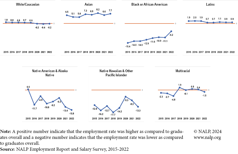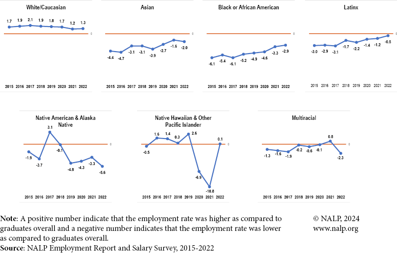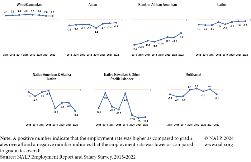 There have been long-standing disparities in employment outcomes for graduates of color as compared to White graduates and new data from NALP's Class of 2022 Employment Report and Salary Survey show that while some of these gaps have narrowed over the past eight years, others have widened. For example, although gaps have lessened for Asian, Black, and Latinx graduates, concerning increases are observed in several areas for Native American, Alaska Native, Native Hawaiian, and other Pacific Islander graduates.