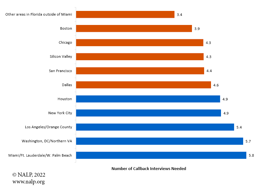 Of course, these figures are averages and reflect survey responses for each year across a range of firm sizes and geographic regions. And although acceptance rates vary by firm size, the callback interview ratio in fall 2021 varied only from 4.6 interviews at firms of more than 700 lawyers to 5.3 interviews at the smallest firms of 100 or fewer lawyers. Regionally, there was more variability — with offices in the West/Rocky Mountain region reporting the smallest number of callback interviews (4.1) to result in one accepted offer compared to 5.4 callback interviews in the Mid-Atlantic region. Information for selected cities is presented in Chart 1. Of those locations with at least 10 offices reporting data, areas in Florida were found on both ends of the spectrum. Locations in Florida outside of Miami had the lowest number of callback interviews needed to result in one accepted offer (3.4), while the Miami area had the highest (5.8).