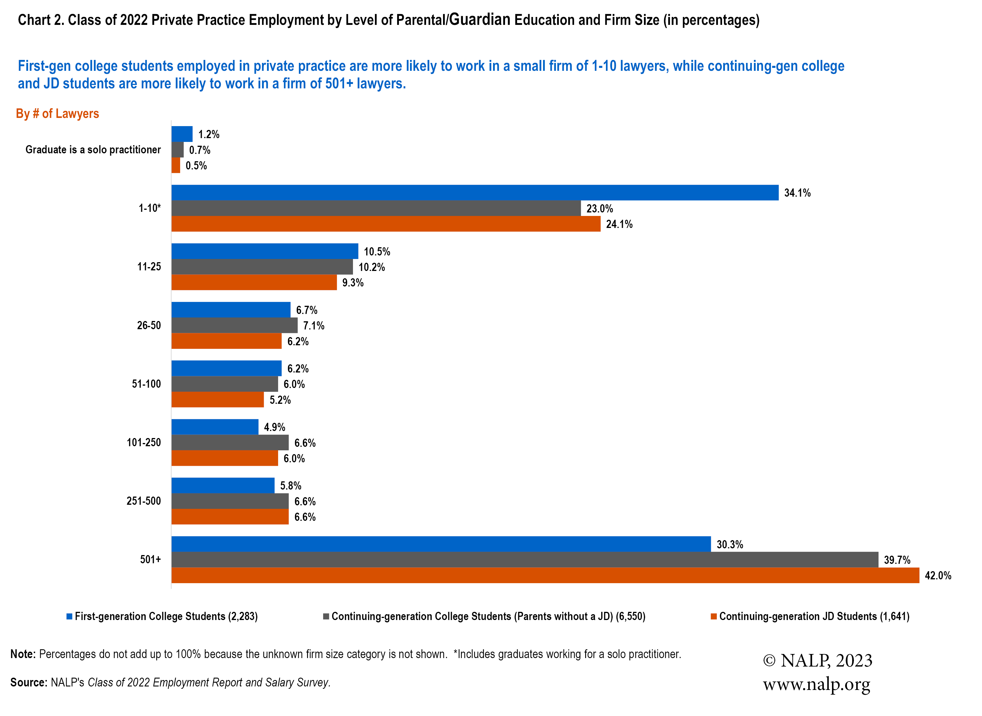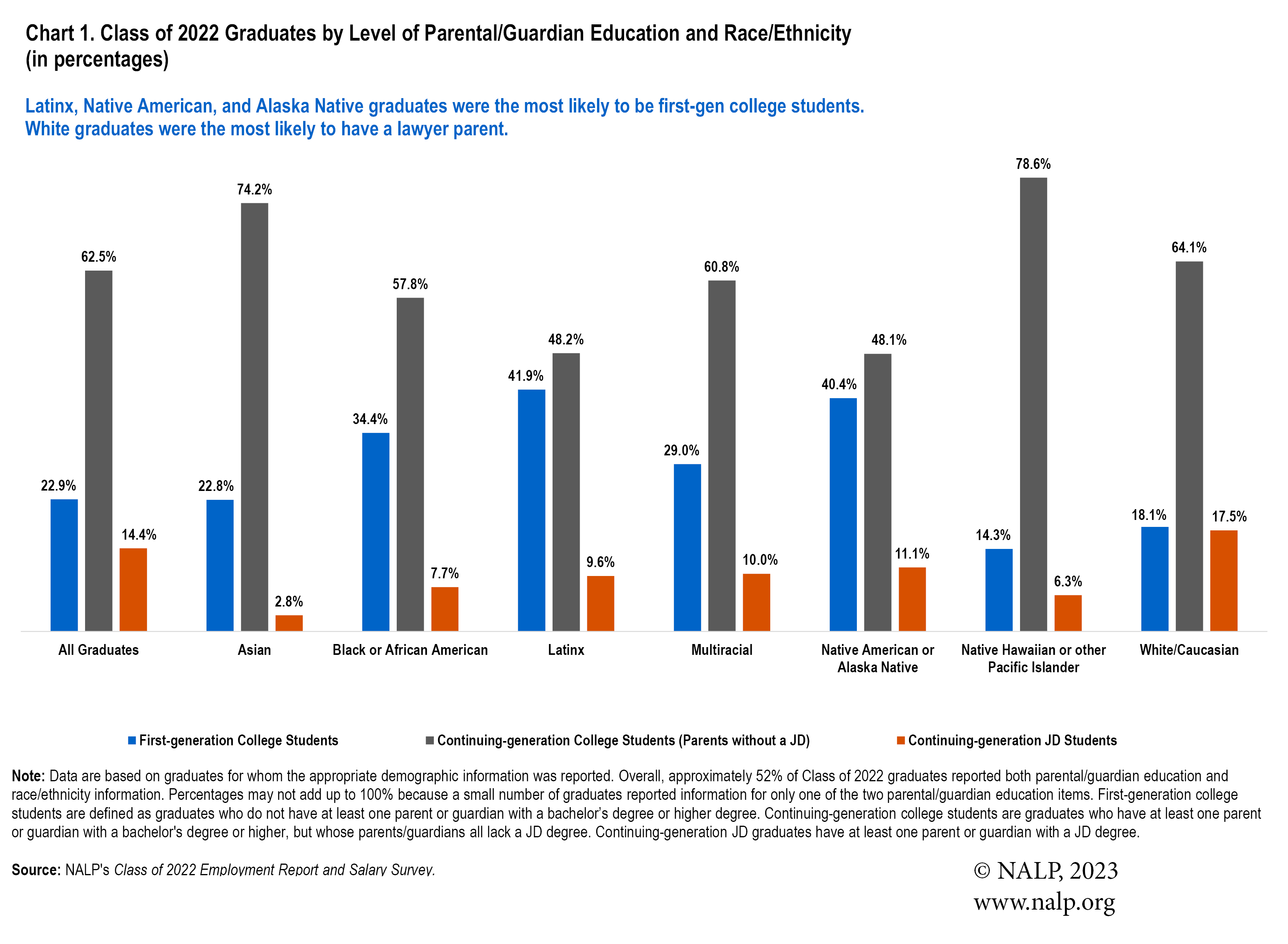 Additional information on employment outcomes by level of parental education is included in Jobs & JDs: Employment and Salaries of New Law Graduates, Class of 2022 — available for purchase in the NALP Bookstore.