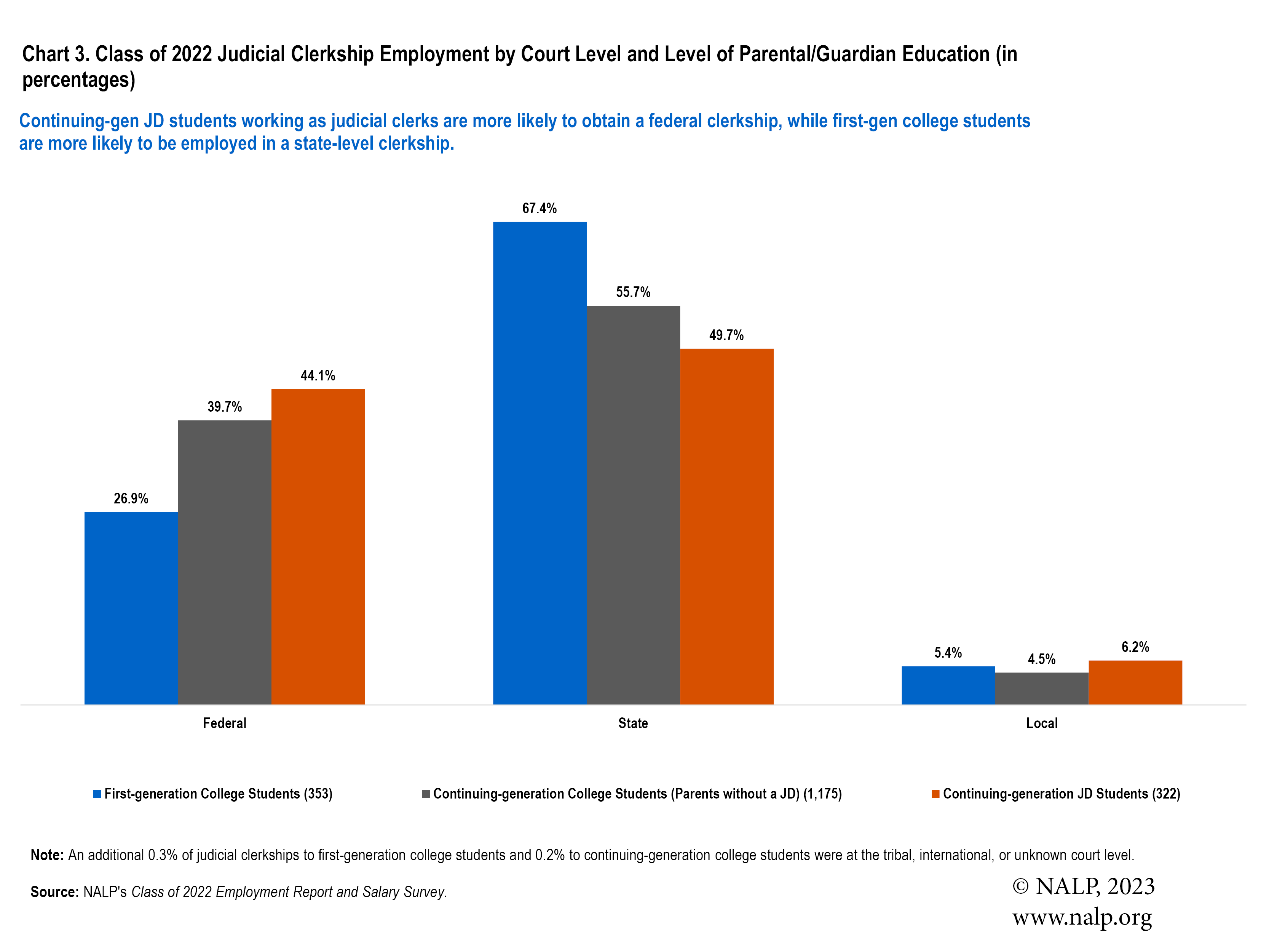 Chart 3 displays differences in judicial clerkship employment by level of clerkship for graduates, again recognizing that first-gen college students are less likely to obtain a judicial clerkship to begin with. First-generation college students with clerkships were employed in state clerkships at a higher rate, while continuing-generation JD students were more likely to hold federal clerkships.