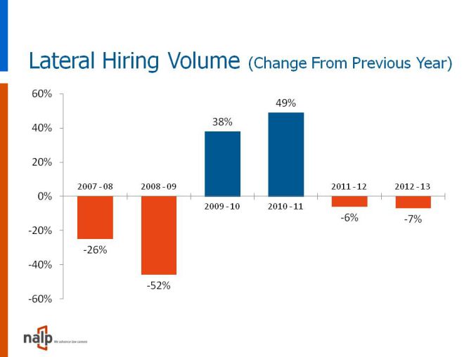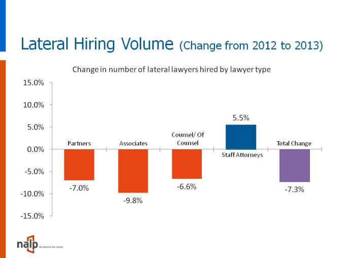 - Overall, based on aggregate hiring of over 5,100 lateral lawyers in 2013, the volume of hiring was off by 7.3% compared with 2012, with a median of 5 and an average of just over 11 lateral hires (Table 1.) Much of the decrease was driven by a decline in lateral associate hiring, which accounted for 58% of lateral hiring in 2013, and where aggregate hiring was off by almost 10%. The categories of counsel/of counsel and staff attorney accounted for just 20% of lateral hiring in 2013, and as the median figures suggest, the majority of offices did not do any hiring of this type in 2013. However, in contrast to other categories of lateral hires, aggregate hiring of lateral staff attorneys increased by over 5%.