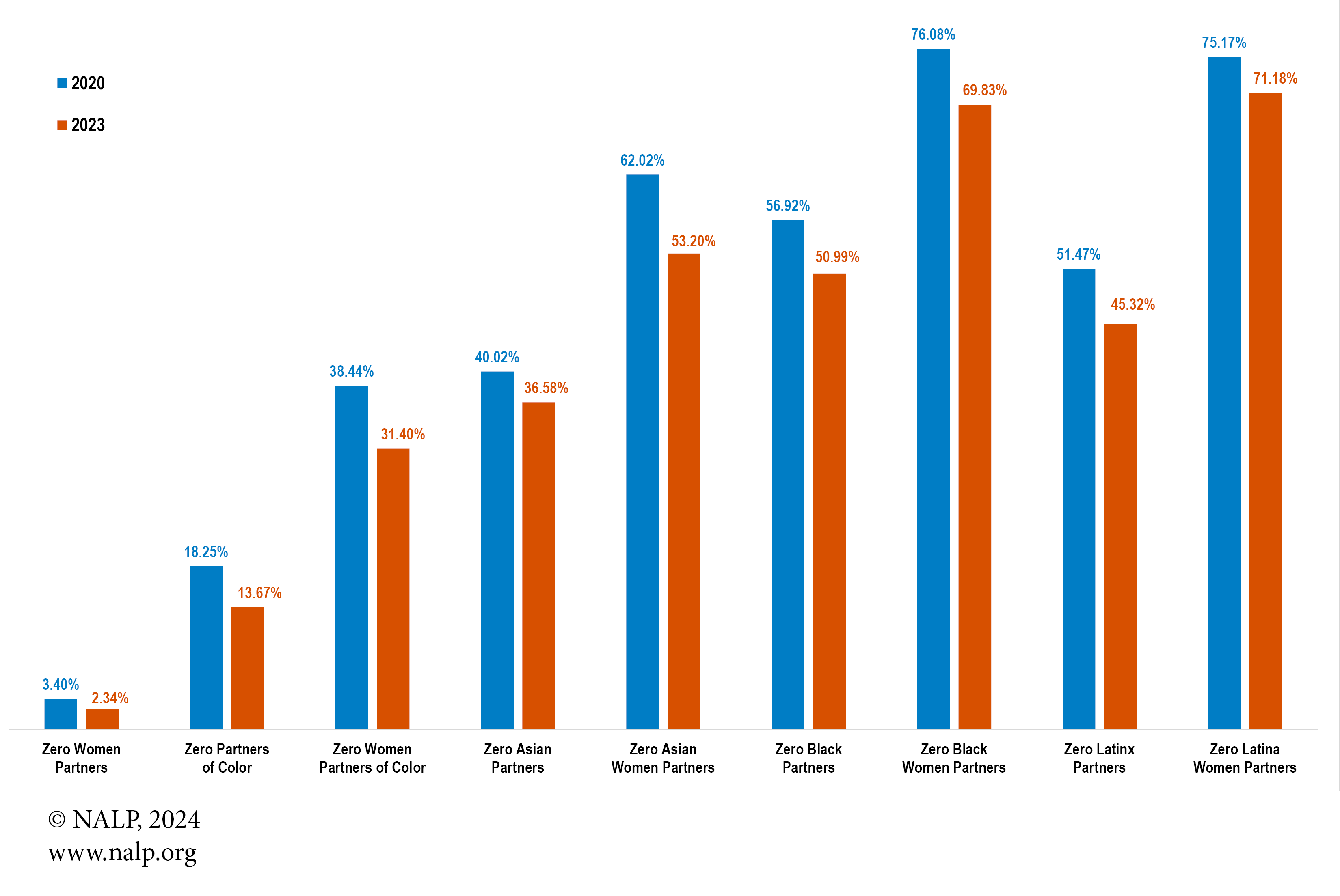 Note: These figures represent the percentage of all offices that did not have any partners represented from a group or subgroup in 2020 as compared to 2023.