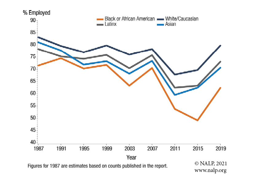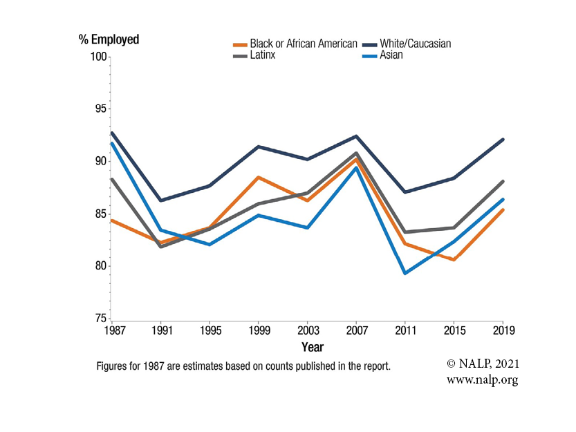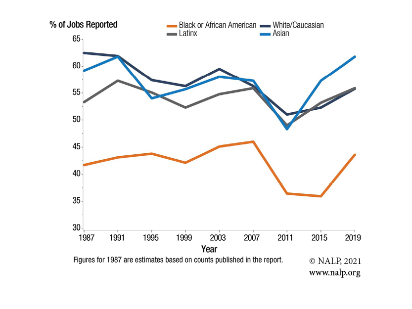 We have had, for almost all of NALP's 50-year history, at least some information about what law school graduates do once they graduate and — generally — become licensed to practice law. Published annually for 45 years, our series of reports provides many answers. But as a contribution to NALP's recent commitment to use its data to document racial disparities in the legal profession, I have compiled trends in selected metrics by race and ethnicity. Some of these figures have appeared in earlier publications, others were compiled specifically for this column.