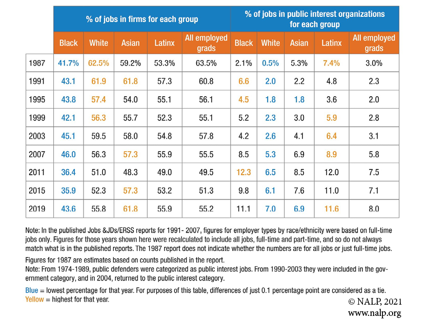 While apples-to-apples comparisons are not always possible, data from NALP's annual Employment Report & Salary Survey (ERSS) have provided some key insights into employment and salary outcomes for law school graduates. As we celebrate NALP's 50th Anniversary in 2021, it's important to look back at the ways the ERSS has evolved through the years, while examining some of the stark realities that this ongoing data collection has allowed us to document — specifically the persistent gaps in employment outcomes by race and ethnicity.