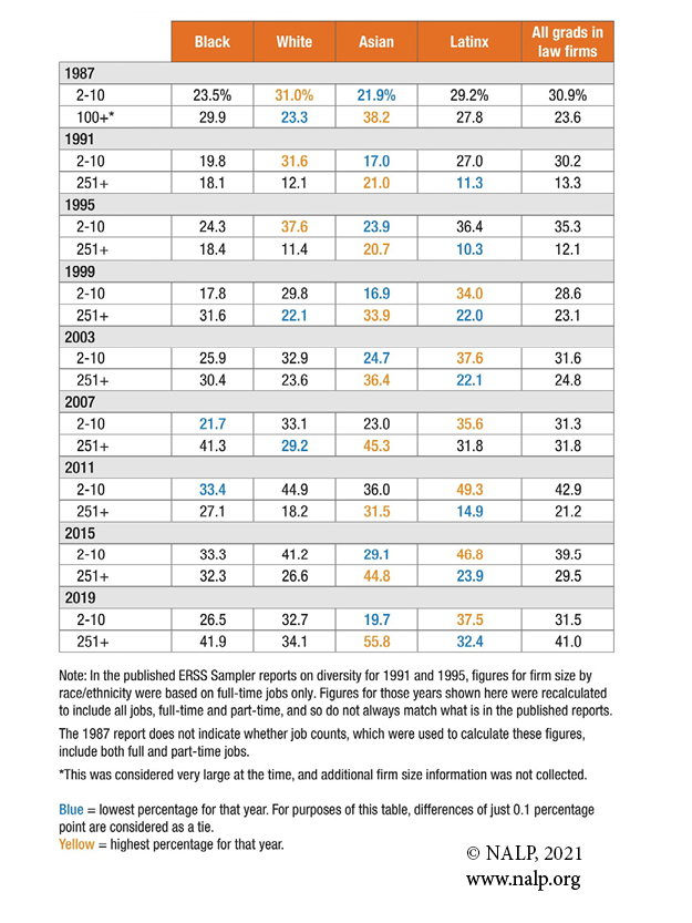 Table 2: Percent of Law Firm Jobs by Size of Firm and Race/Ethnicity for Selected Years, 1987-2019