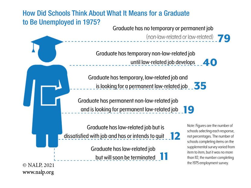 The report noted the need for better definitions, distinguishing, for example, the status of a graduate who has a temporary but law-related job from the graduate who is a clerk in a grocery store — the equivalent to today's stereotype of barista or Uber driver. The committee further queried as to whether graduates who had not passed the bar exam should even be considered as being in the job market, and that perhaps there should be a category for such graduates on the survey for the Class of 1976.