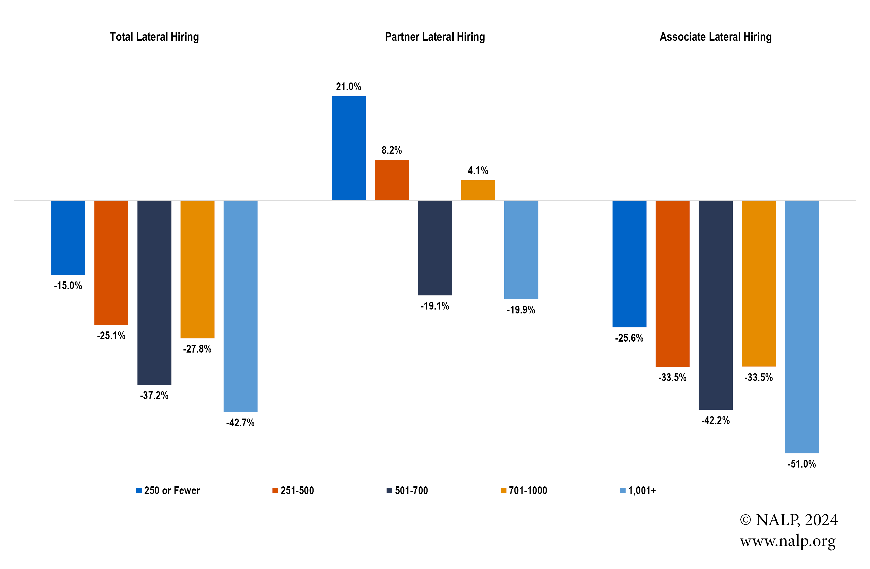 Note: Data by firm size is inclusive of both firm-wide/multi-office and office-specific reporting. Total lateral hiring includes partner, associate, and other lateral lawyer hires.