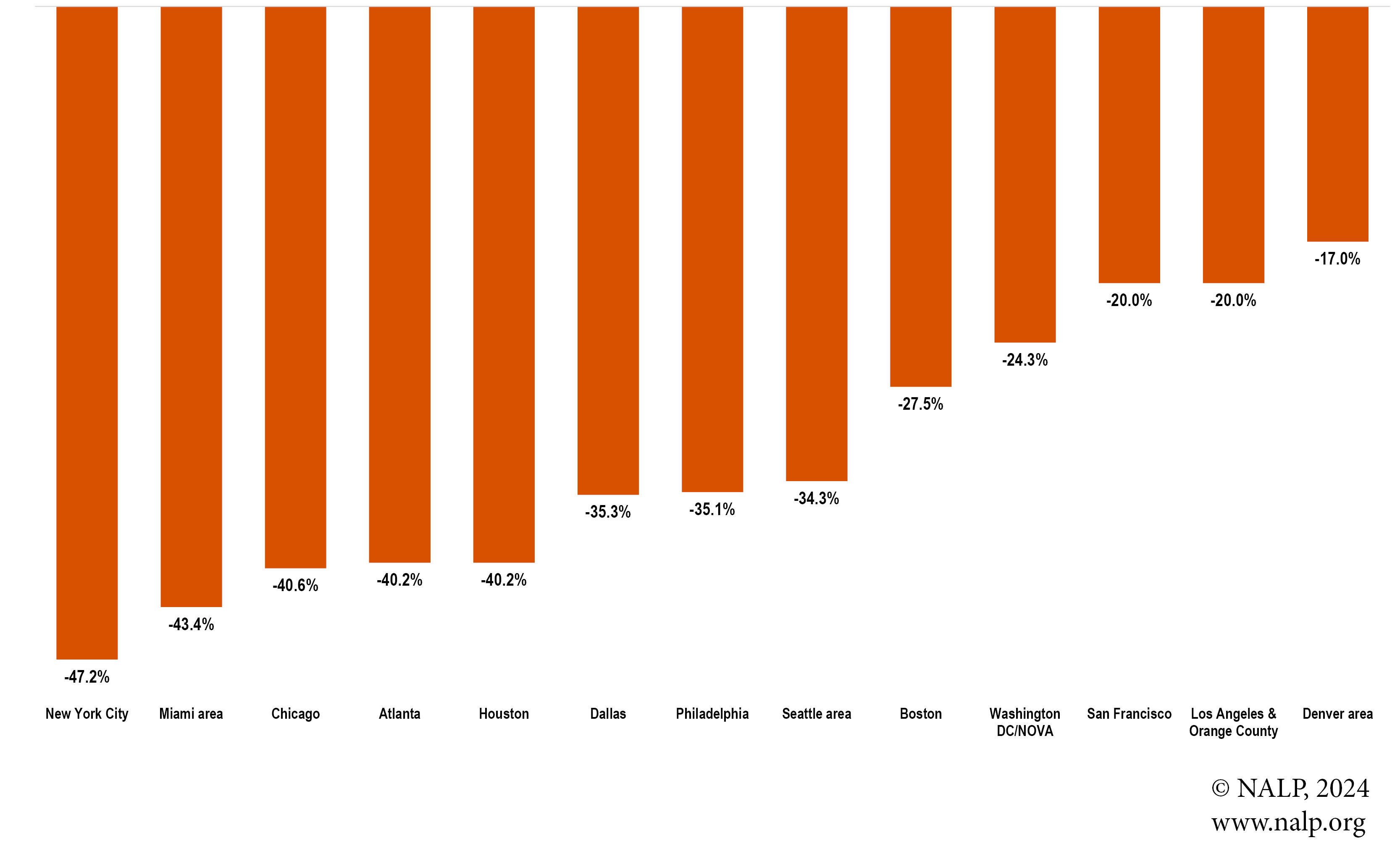 Among cities reporting at least 40 lateral hires in 2023, the percent change in lateral hiring from 2022 to 2023 ranged from a decline of 17.0% in Denver to a decline of 47.2% in New York City. (See Chart 2.)