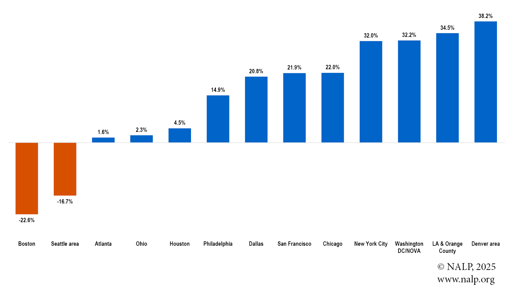 On a city level, lateral partner hiring varied from a decrease of 80.0% in the Seattle area to an increase of 225% in Charlotte. Similarly, lateral associate hiring varied from a decrease of 60.0% in Nashville to an increase of 66.2% in Los Angeles and Orange County.