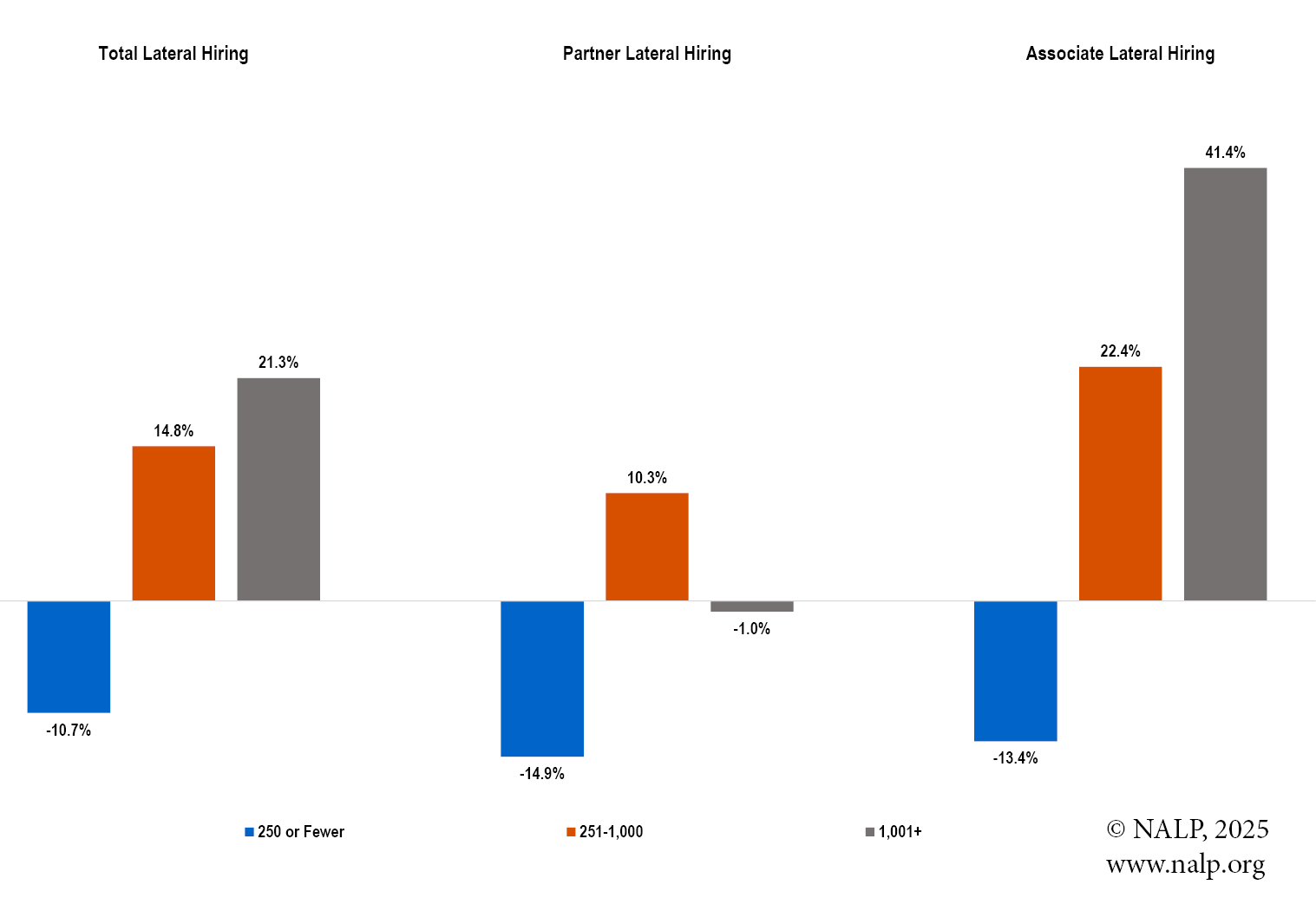 Changes in lateral hiring as compared to 2023 varied by firm size. For example, lateral associate hiring experienced a significant increase within firms of 1,001+ lawyers, up 41.4%; whereas, lateral hiring in firms of 250 of fewer lawyers declined across all lawyer categories this year, with a 14.9% decrease in lateral partner hiring and 13.4% decrease in lateral associate hiring. In contrast, lateral hiring was up across all lawyer categories in firms of 251-1,000 lawyers. (See Chart 1.)