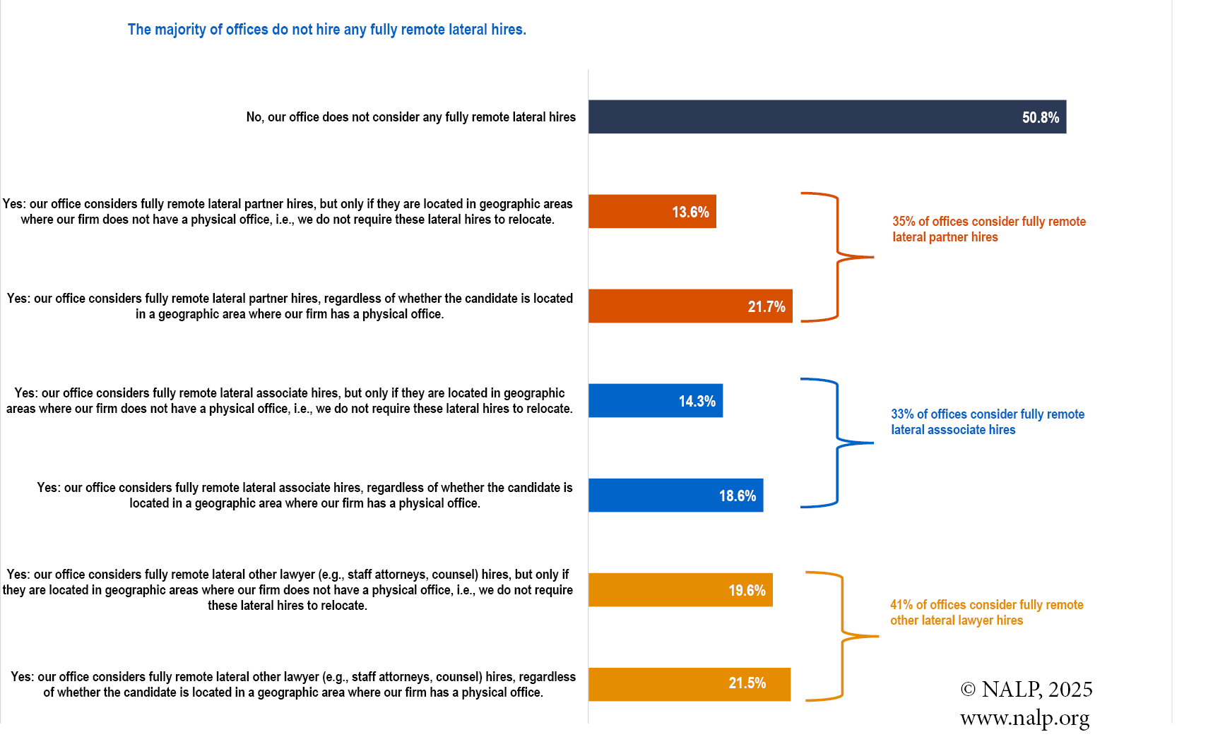 Note: Percentages are based on responses from 419 offices to a question regarding their general office policies surrounding the hiring of fully remote lateral lawyers. This is different that the data presented in Table 3, which is specific to hiring that occurred in calendar year 2024.