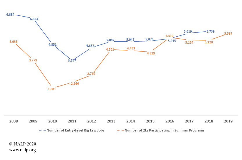 Note: Data for 2Ls include the number of 2Ls participating in summer programs in the year listed. Data on entry-level big law jobs (defined as those in law firms of 251+ lawyers) are for the graduating class year referenced. Data on entry-level big-law jobs for the Class of 2019 are not yet available as of the time of publication.