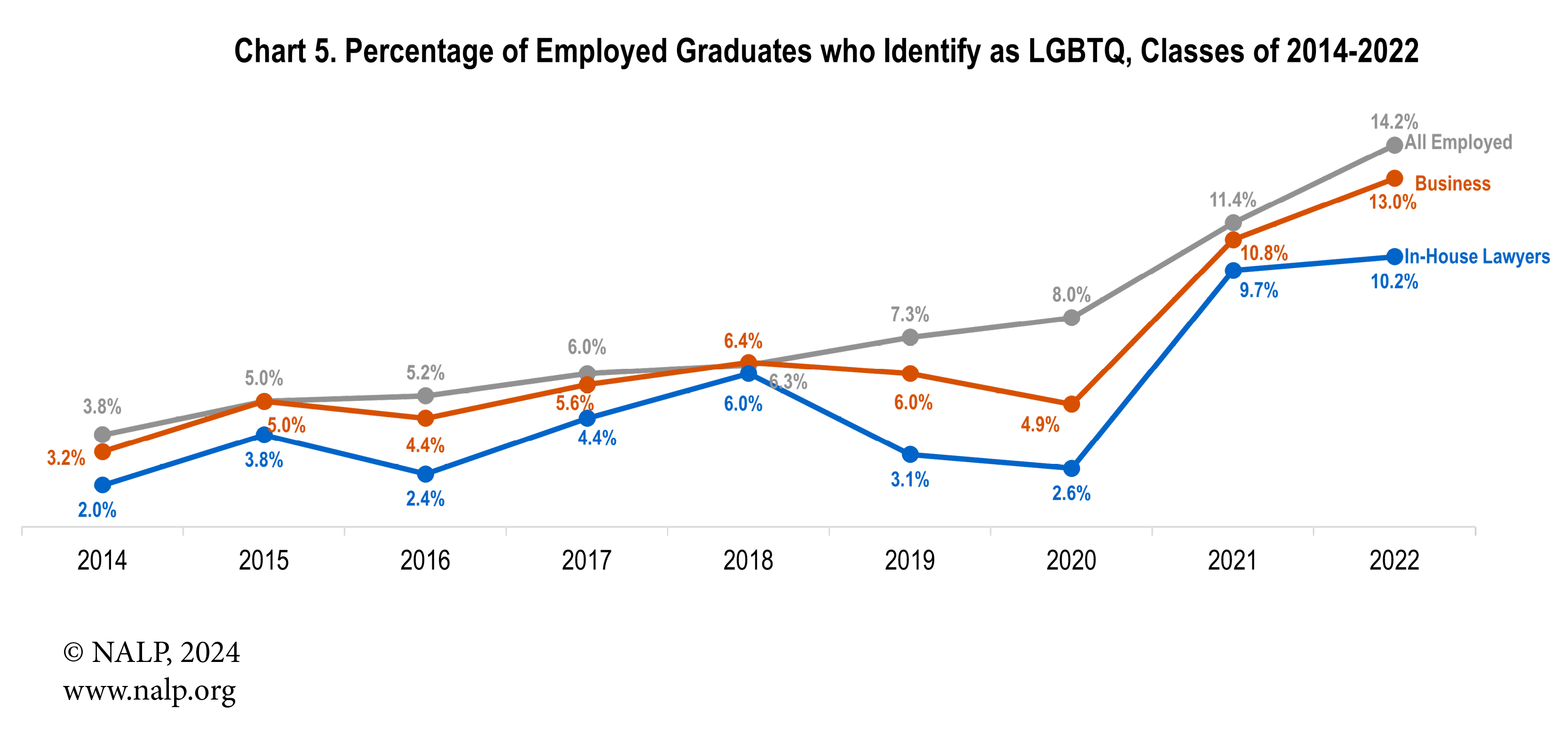 Note: NALP began tracking this demographic item with the Class of 2014. Prior to the Class of 2020, only graduates who identified as gay, lesbian, or bisexual are included in these figures.