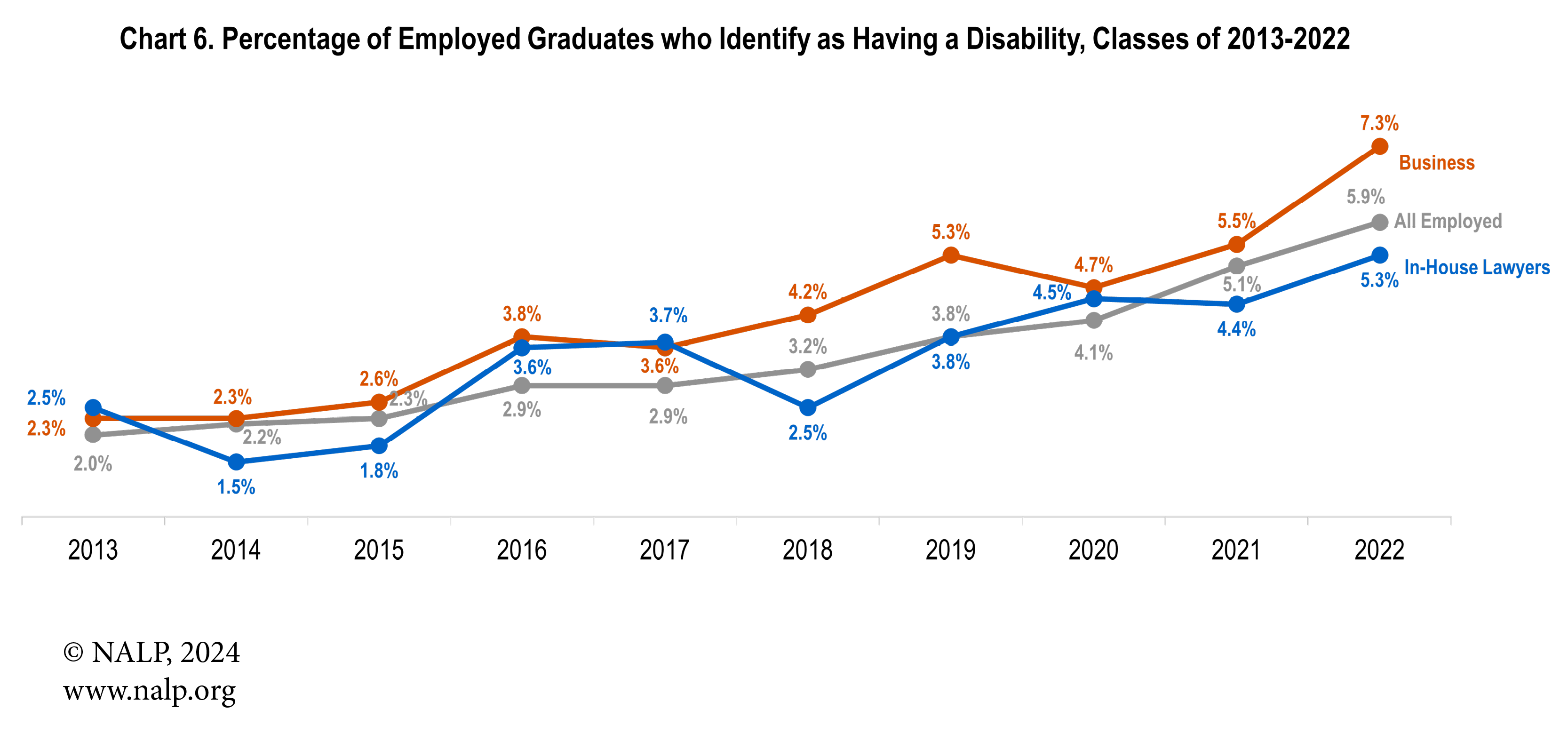 LGBTQ graduates are generally employed at lower rates in business, but especially so as in-house lawyers where they are typically underrepresented by about two to six percentage points. (See Chart 5.) In contrast, graduates identifying as having a disability have consistently been more likely to be employed in business; however, they comprise a smaller share of all in-house lawyers. (See Chart 6.)
