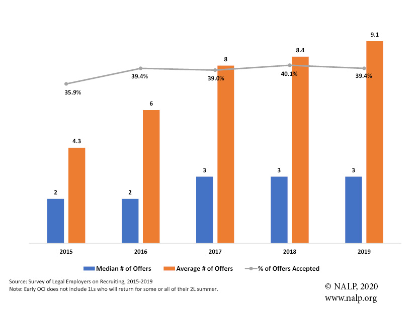 Chart 1 depicts the average and median number of early offers made and the percentage of early offers accepted from 2015-2019. While the median number of early offers per office/firm has only increased from two to three offers during this time period, the average number of early offers has more than doubled from 4.3 offers in 2015 to 9.1 offers in 2019. Offer acceptance rates have remained stable at 39-40% since 2016.