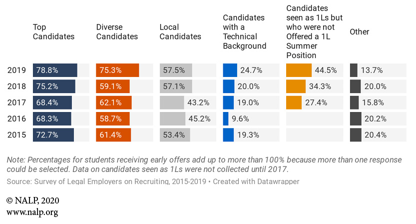 Trends in the types of students that are most likely to receive early offers are illustrated in Chart 2. Overall, top candidates have been the main target of offices/firms for early OCI offers, with 79% reporting that they made early offers to top candidates in 2019, but diverse candidates were a close second at 75%. Local candidates were also attractive candidates to firms, with nearly 58% of firms that made early offers in 2019 reporting that they made at least some of those offers to local candidates.