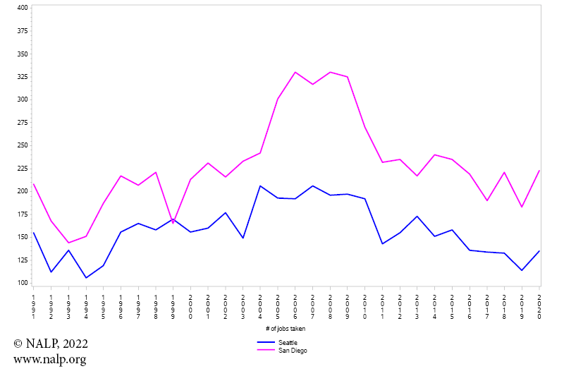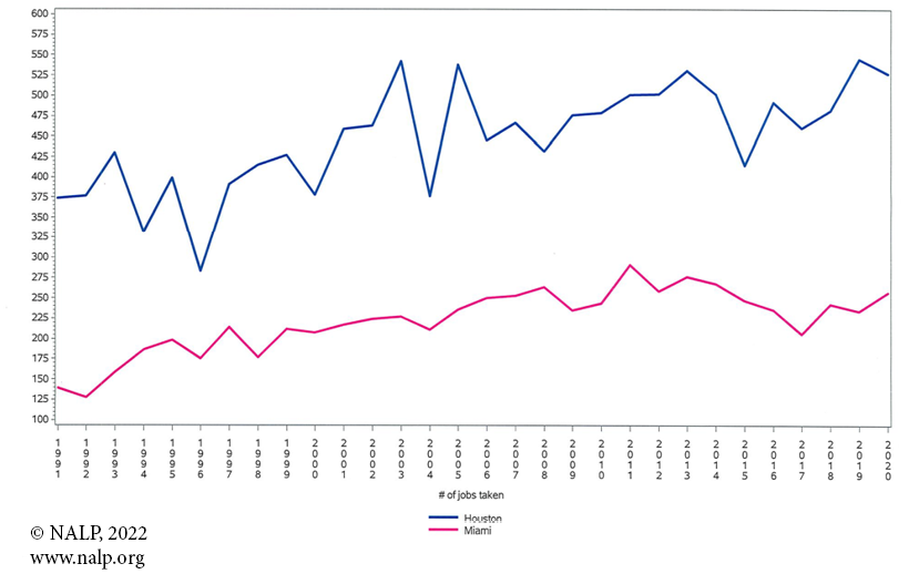 Let's look at a few case studies of year-by-year counts. Houston and Miami both experienced substantial growth from 1991-2020 (see Figure 1). Houston notched high job counts in 2003 and 2019 (about 545) followed closely by 2013 and 2020 (about 530). Job numbers in Miami followed a general upward trajectory through 2011, reaching a high in 2011. Figures then declined, but have come up in recent years, close to pre-recession levels. Compared to some rather dramatic ups and downs in Houston, those in Miami are far more modulated.