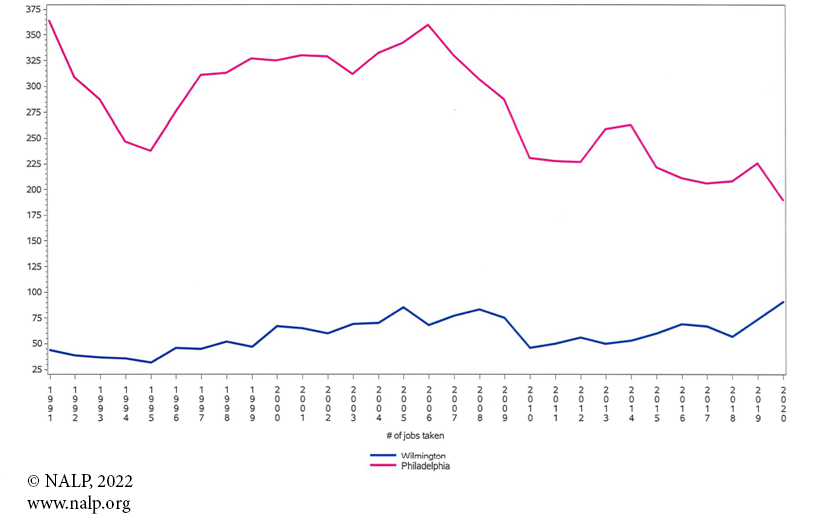 Figure 2. Number of Jobs — 1991-2020 — Philadelphia and Wilmington, DE