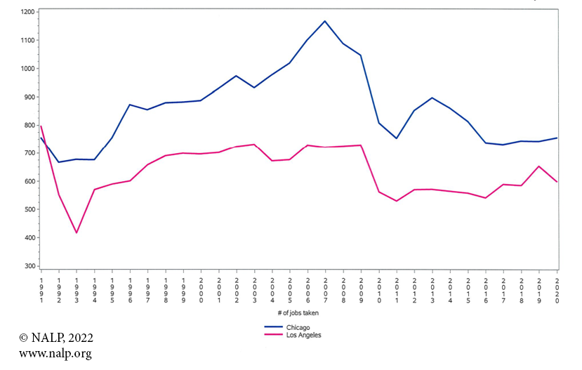 Figure 3. Number of Jobs — 1991-2020 — Chicago and Los Angeles