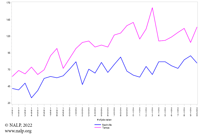 Figure 3b. Number of Jobs — 1991-2020 — Nashville and Tampa