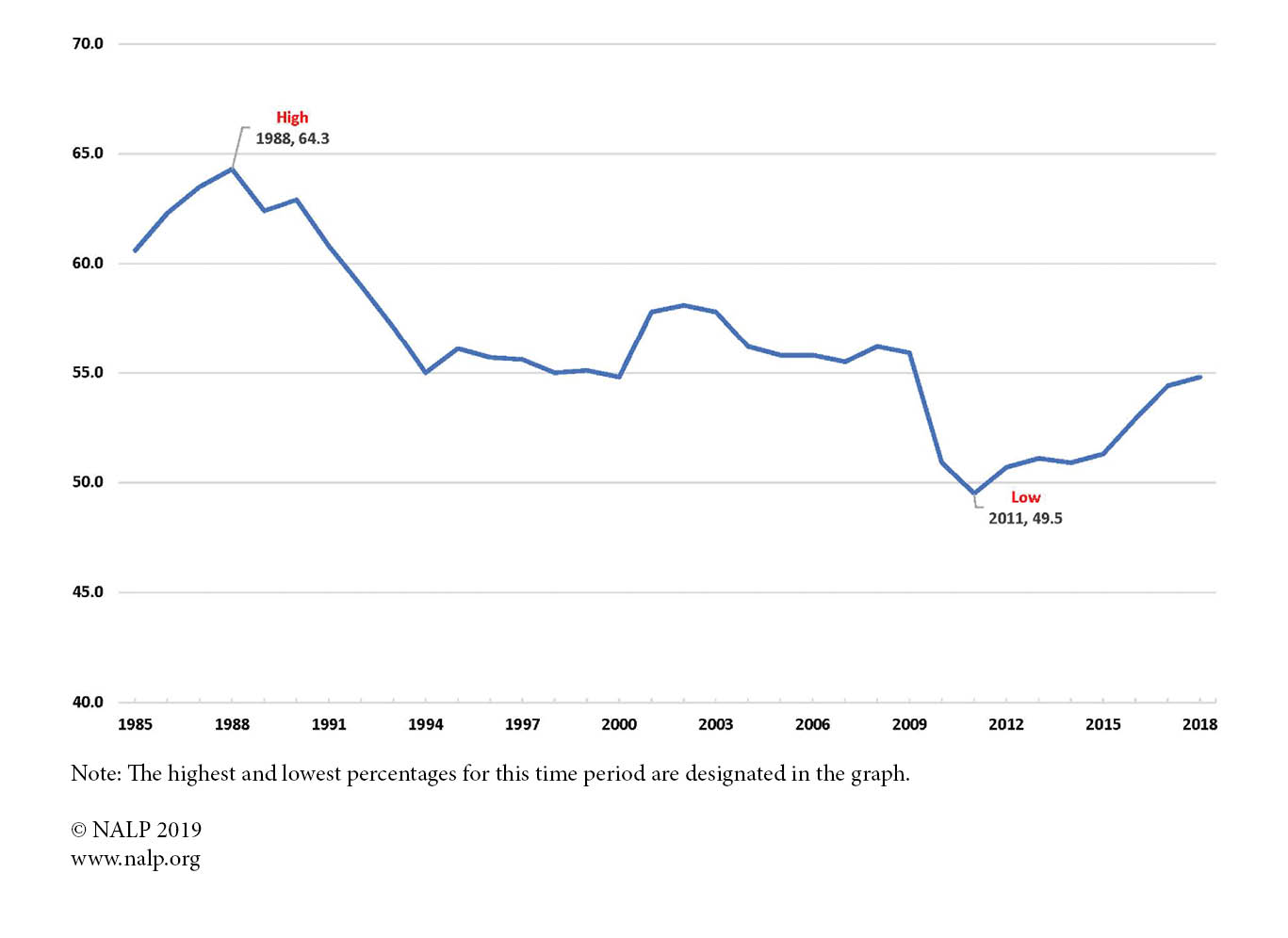 Chart 1. Percentage of Jobs in Law Firms, Classes of 1985-2018
