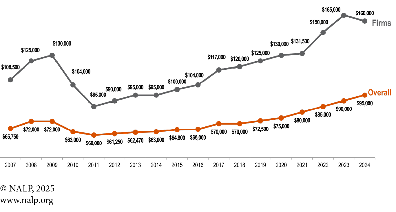 Chart 1. Overall and Median Law Firm Salaries, Classes of 2007-2024