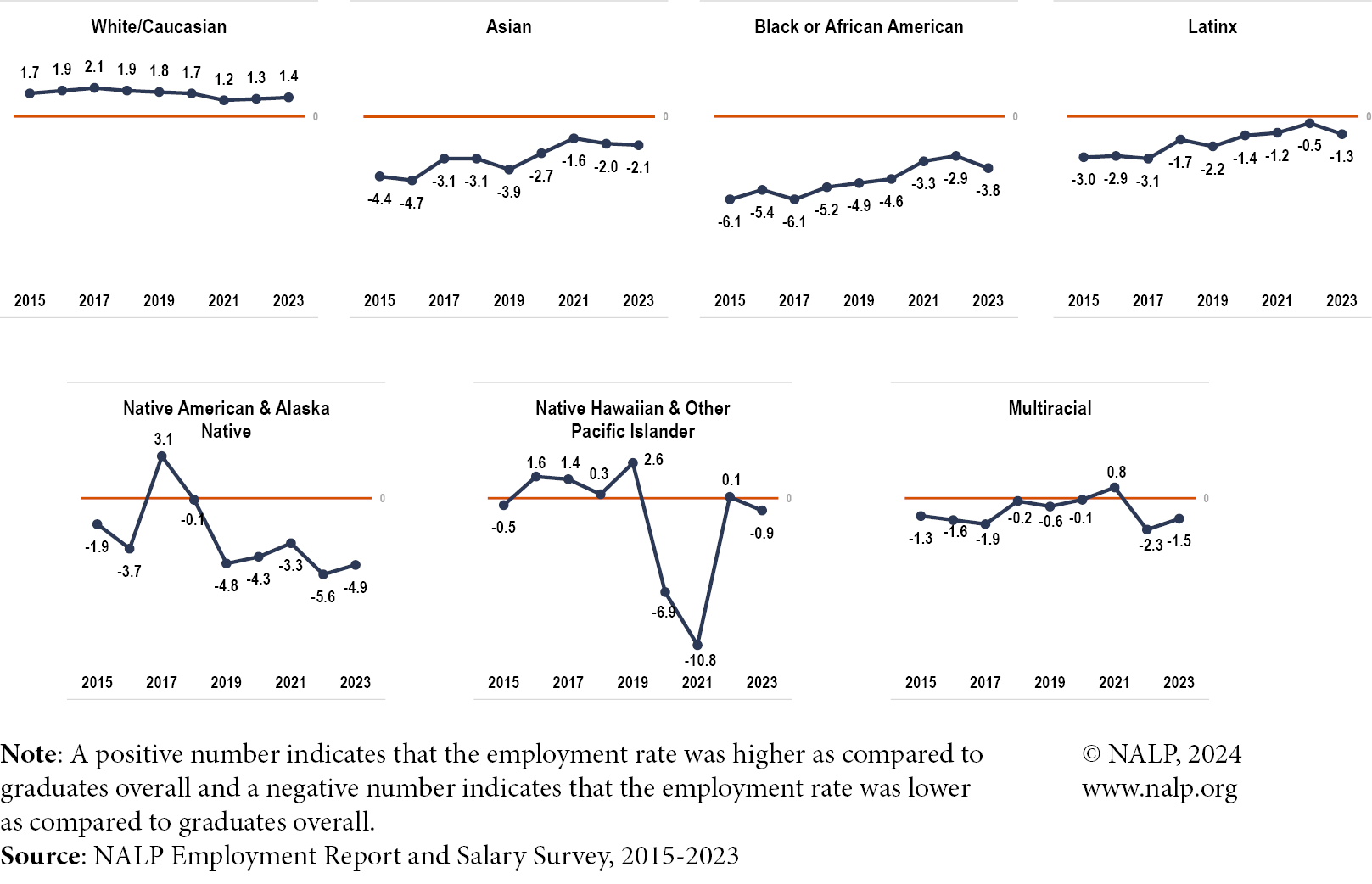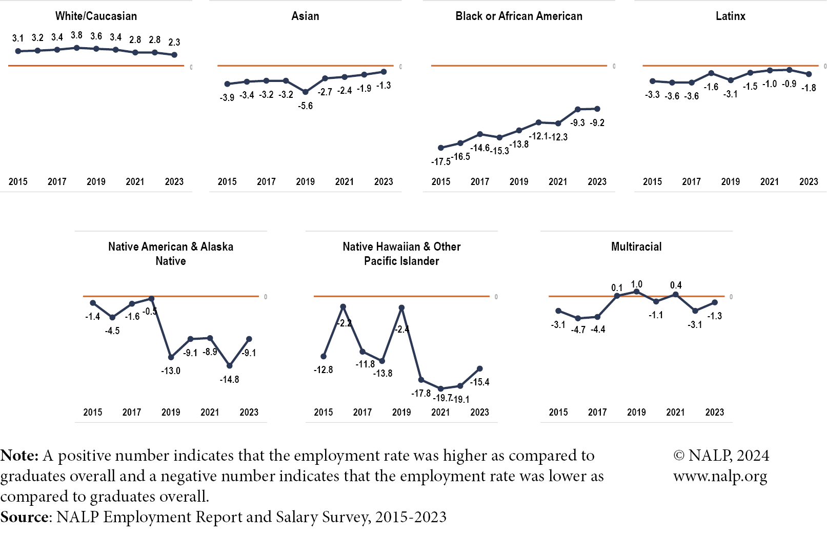 While there has been some positive progress in reducing disparities in employment outcomes, significant gaps persist, especially for Black, Native American, Alaska Native, Native Hawaiian, and other Pacific Islander graduates. The increasing disparities in overall employment rates for most groups in 2023 is also a cause for concern and NALP plans to closely monitor these data moving forward.