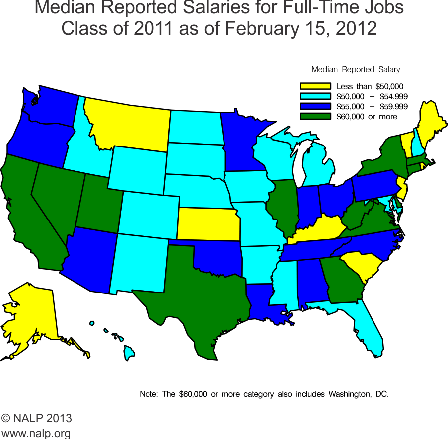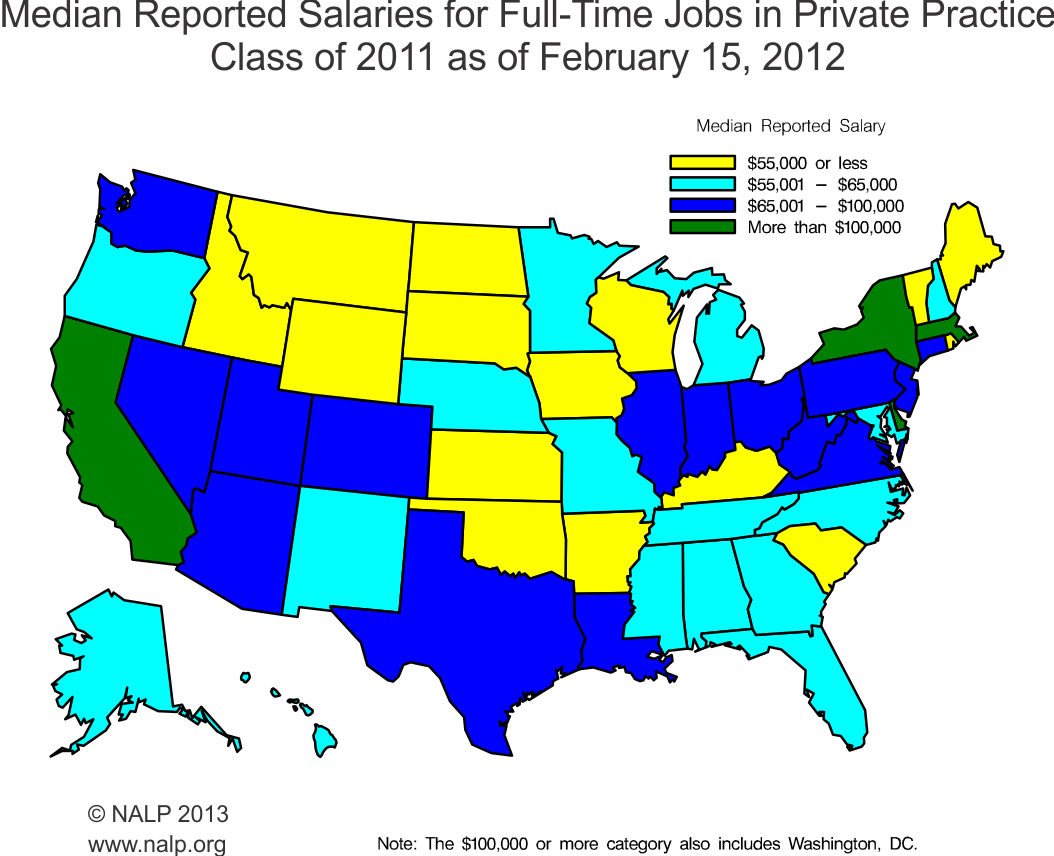 Source: NALP graduate employment survey for the law school Class of 2011. A tabular presentation of medians by state can be found in Jobs & JDs: Employment & Salaries of New Law Graduates - Class of 2011.
