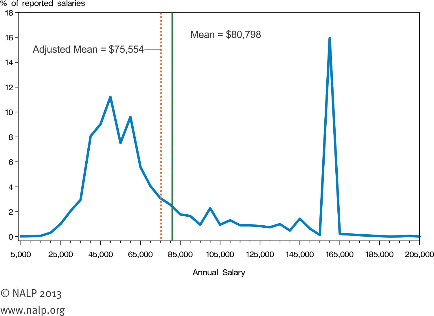 For a historical perspective, see the salary curves for the previous classes at http://www.nalp.org/salarydistrib, and also an August 2012 NALP Bulletin article, “Salaries for New Lawyers: How Did We Get Here,” that traces the origin of the bimodal curve.