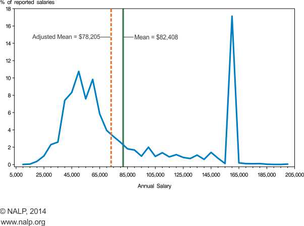 For a historical perspective, see the salary curves for the previous classes at http://www.nalp.org/salarydistrib, and also an August 2012 NALP Bulletin article, “Salaries for New Lawyers: How Did We Get Here,” that traces the origin of the bimodal curve.