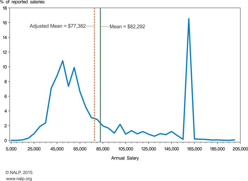 Note: Graph is based on 22,095 salaries reported for full-time jobs lasting a year or more. A few salaries above $205,000 are excluded from the graph for clarity, but not from the percentage calculations. The left-hand peaks of the graph reflect salaries of $40,000 to $65,000, which collectively accounted for about half of reported salaries. The right-hand peak shows that salaries of $160,000 accounted for about 17% of reported salaries. However, more complete salary coverage for jobs at large law firms heightens this peak and diminishes the left-hand peaks — and shows that the unadjusted mean overstates the average starting salary by just over 6%. Nonetheless, as both the arithmetic mean and the adjusted mean show, relatively few salaries are close to either mean. For purposes of this graph, all reported salaries were rounded to the nearest $5,000.