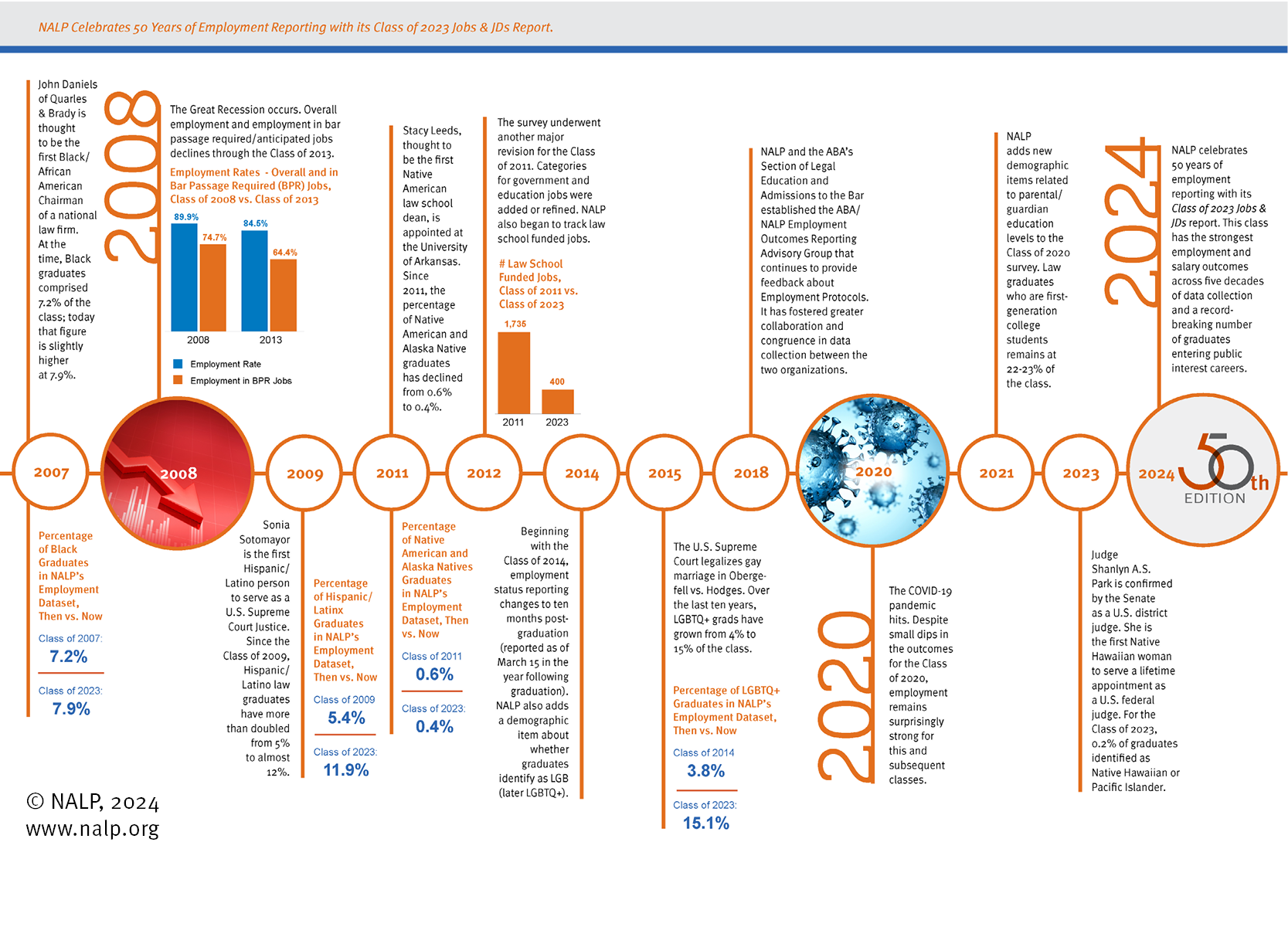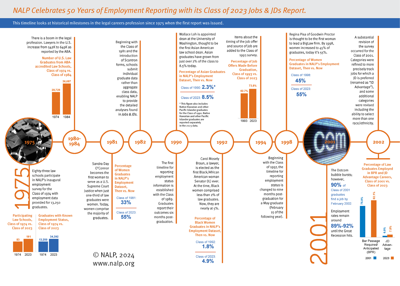 This year marks the 50th year that NALP has reported on law graduate employment outcomes. The timeline below shows historic milestones across five decades of NALP’s employment reporting.