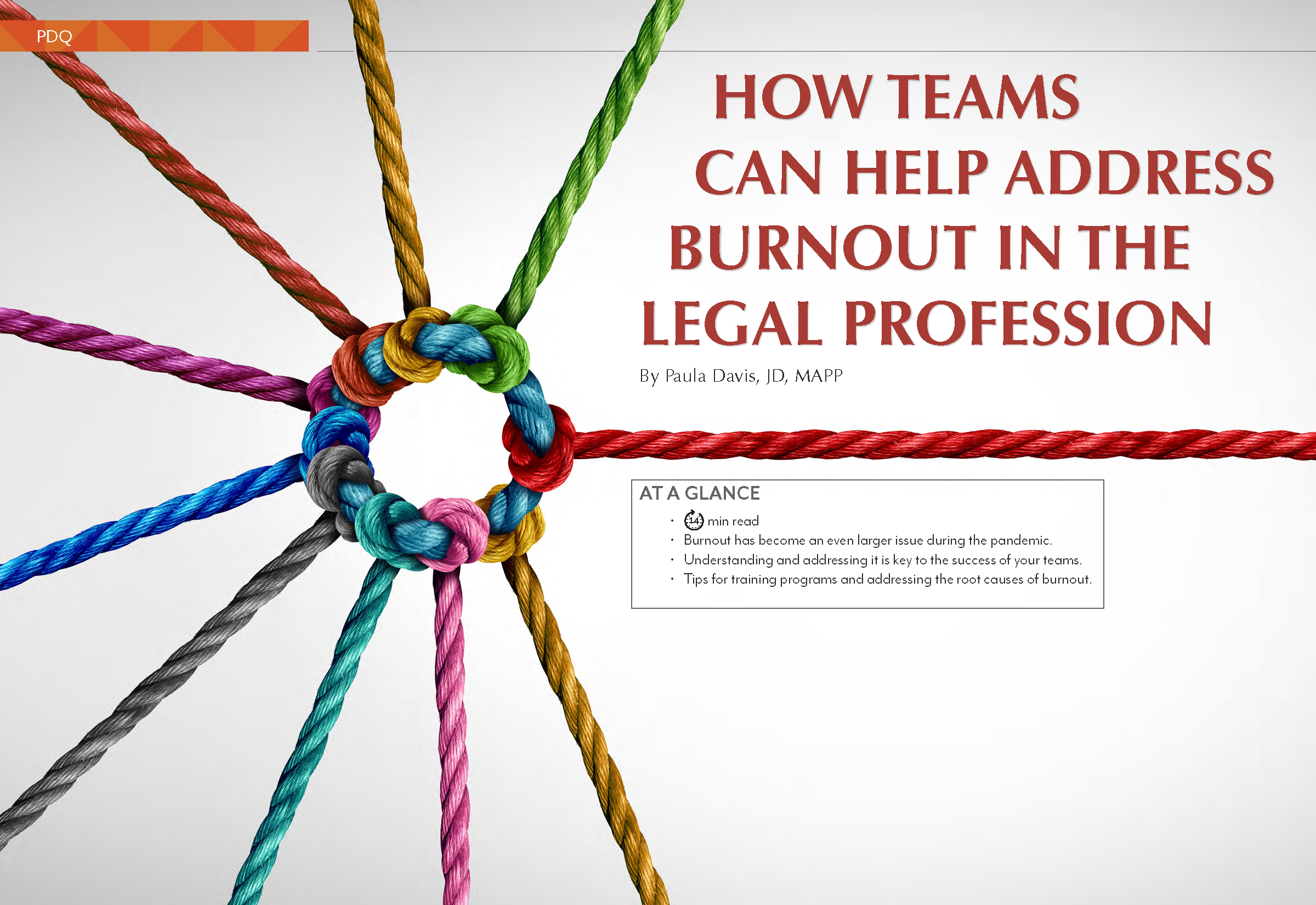 The legal profession has begun to address lawyer well-being through training and the application of research on a variety of topics. Throughout the COVID-19 pandemic, law firms and in-house legal departments con- tinued to invest in and prioritize lawyer well-being; however, nearly all the research, training, and other interventions aimed at increasing well-being in the legal profession have focused on helping individuals anticipate and better manage stress and related challenges. It is now time to explore how the legal community can create teams and environments that are better able to flex and adapt constructively when stress, challenge, and change are present. And there is one issue that many lawyers, legal professionals, law firms, and legal departments are challenged by today — burnout.