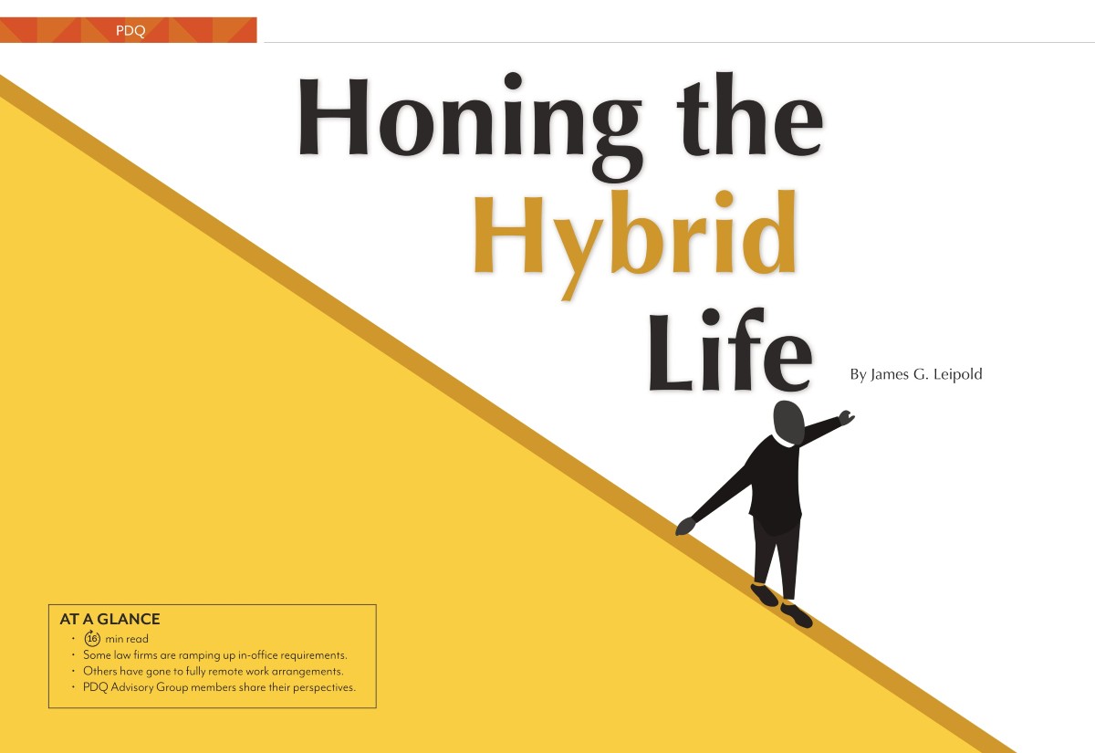During a recent PDQ Advisory Group meeting we had a wide-ranging conversation about the pluses and minuses of this new reality. As a group, we mapped out our thoughts in writing, seeing both the positives and the negatives of our current situation, but everyone agrees that we will never go back to the before-times, never return to a normal that includes everyone working in the office every day. This article shares some of the insights and experiences that this particular group of NALP members has encountered in the hybrid world.