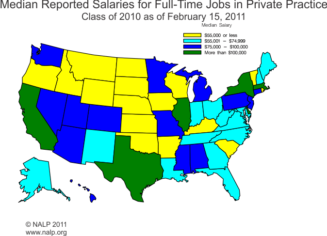 Note: A comparable map based on salaries reported for full-time jobs across all employer types is available here. A tabular presentation of medians by state can be found in Jobs & JDs: Employment & Salaries of New Law Graduates - Class of 2010.