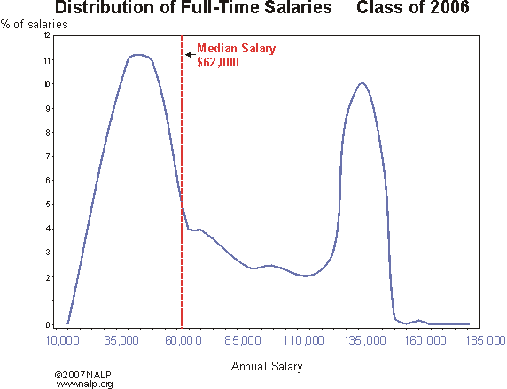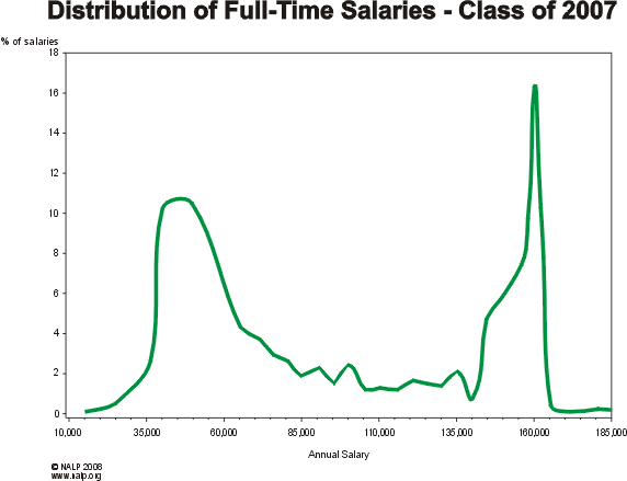 For a number of years NALP has prepared a graphic to illustrate the bi-modal nature of the distribution of salaries obtained by law school graduates. See current years here.