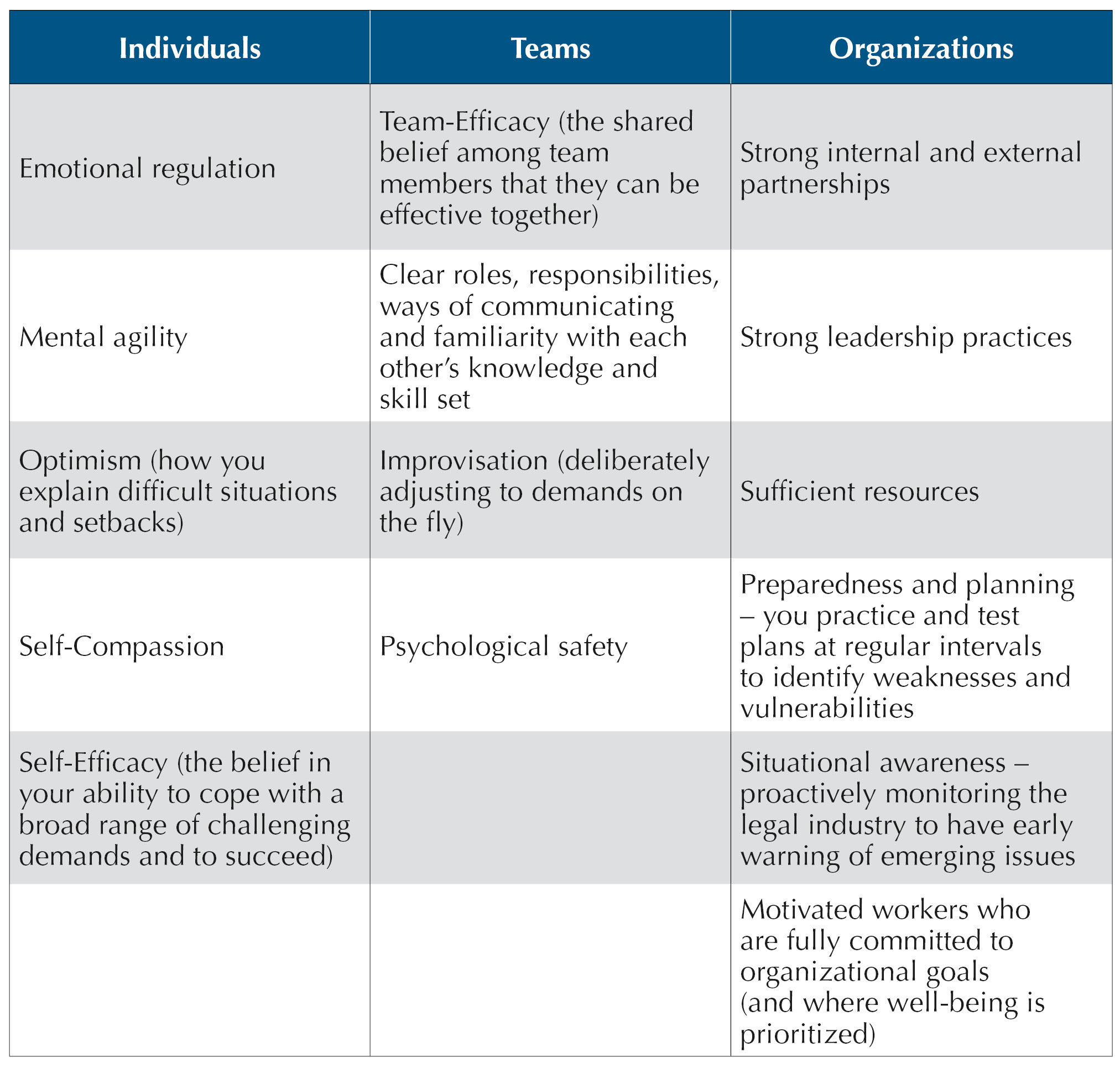 4. Teach “systemic” resilience. The change and uncertainty being driven by Gen AI and the world of work generally requires resilience at all levels. Resilience is a person’s, team’s, and organization’s capacity to navigate uncertainty, change, and stressors and grow and thrive from those challenges. Resilience can refer to how you respond to adverse events in the moment, how your team prepares for events it anticipates will happen, and how your legal organization processes challenges after they have occurred.